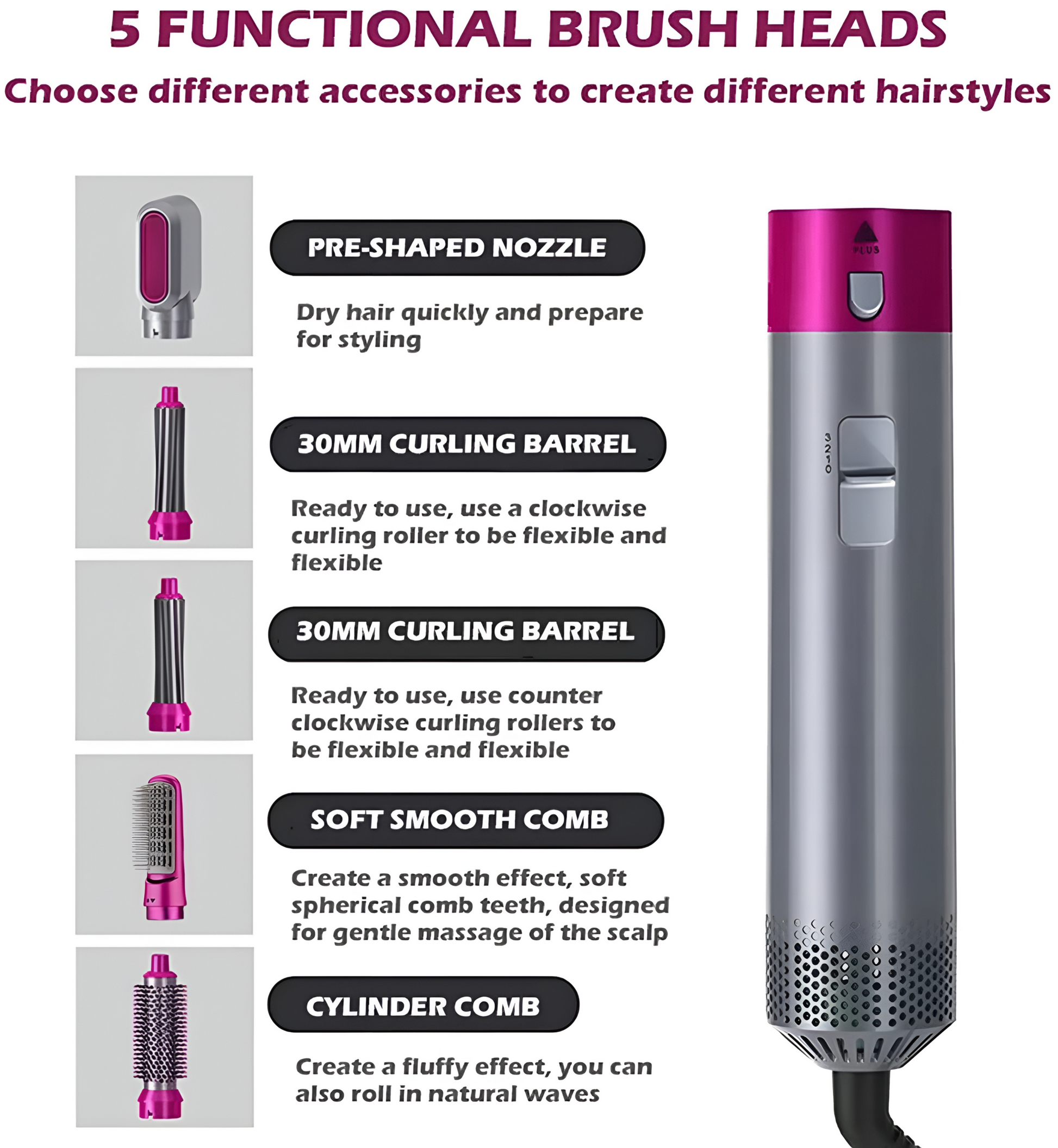 2.) *Versatile Hair Styling*: Not only perfect for drying but also for creating beautiful curls, stunning waves and straight styles. The 5in 1 hair dryer for women comes with different attachments to enjoy the versatility of hair styles in one device.