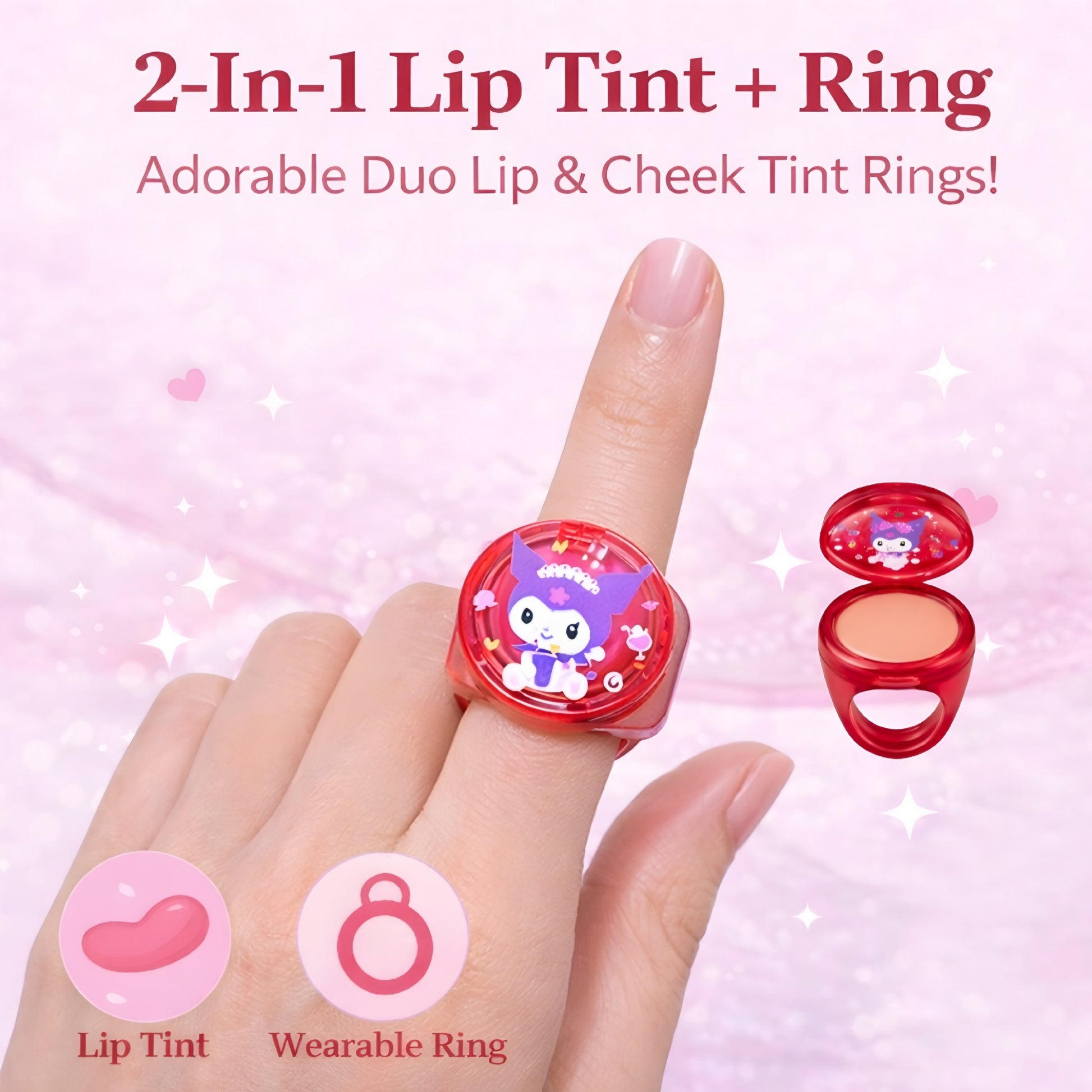 Innovative lip tint ring design that can be worn on your finger like a cute cosmetic ring. A fun and stylish wearable makeup ring that’s always within reach.