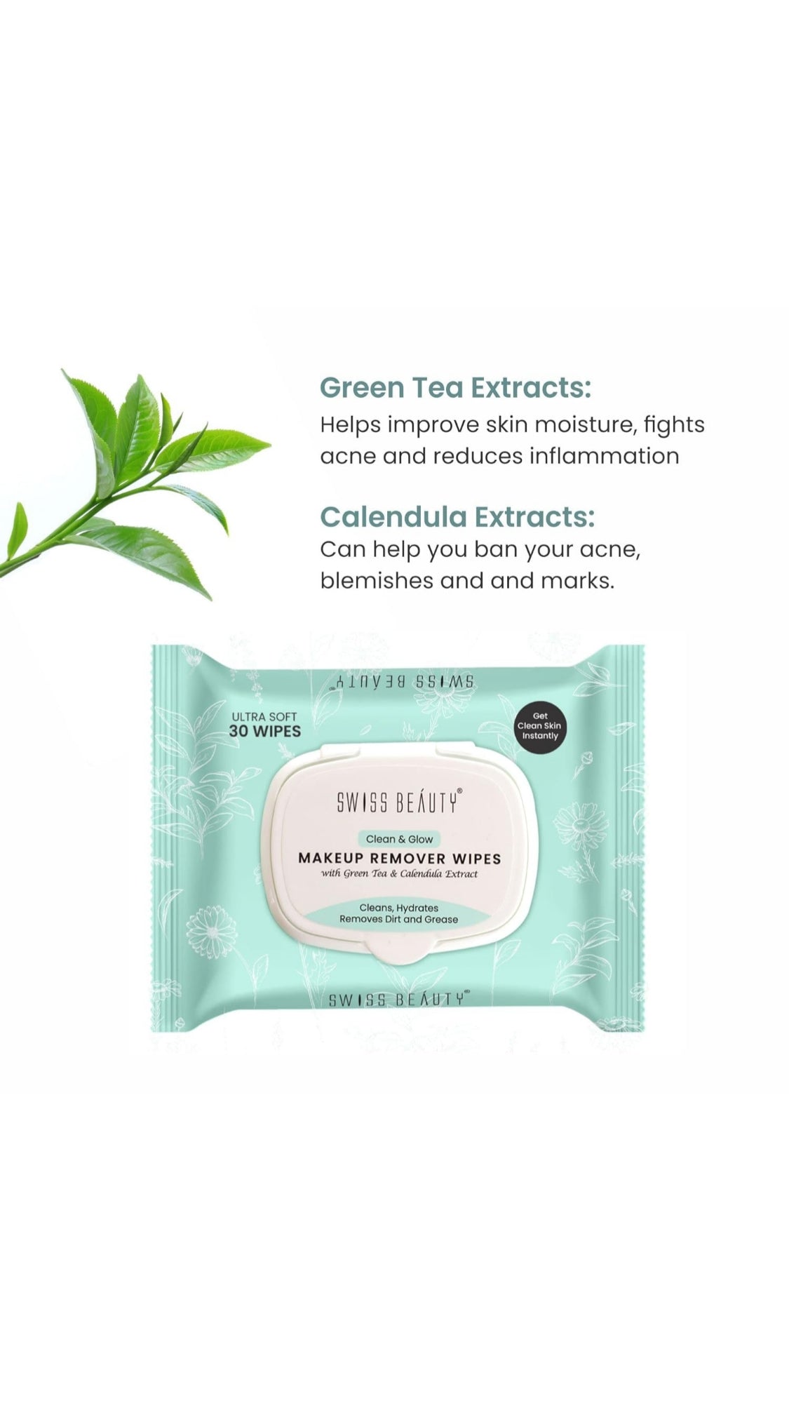 Swiss Beauty Clean & Glow Makeup Remover Wipes | With Green Tea And Calendula Extracts| Cleansing And Hydrating Facial Wipes| 30 Wipes
